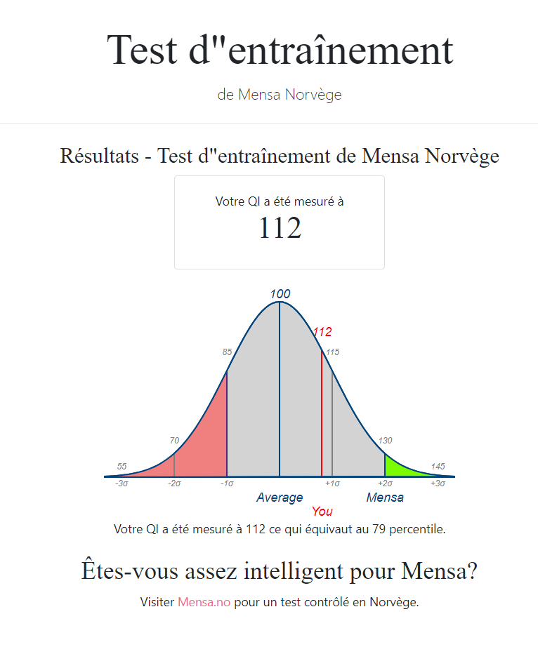 J'ai fait tous les tests mensa en ligne, de souvenir j'ai eu entre 107 et 117, dans ces eaux-là.