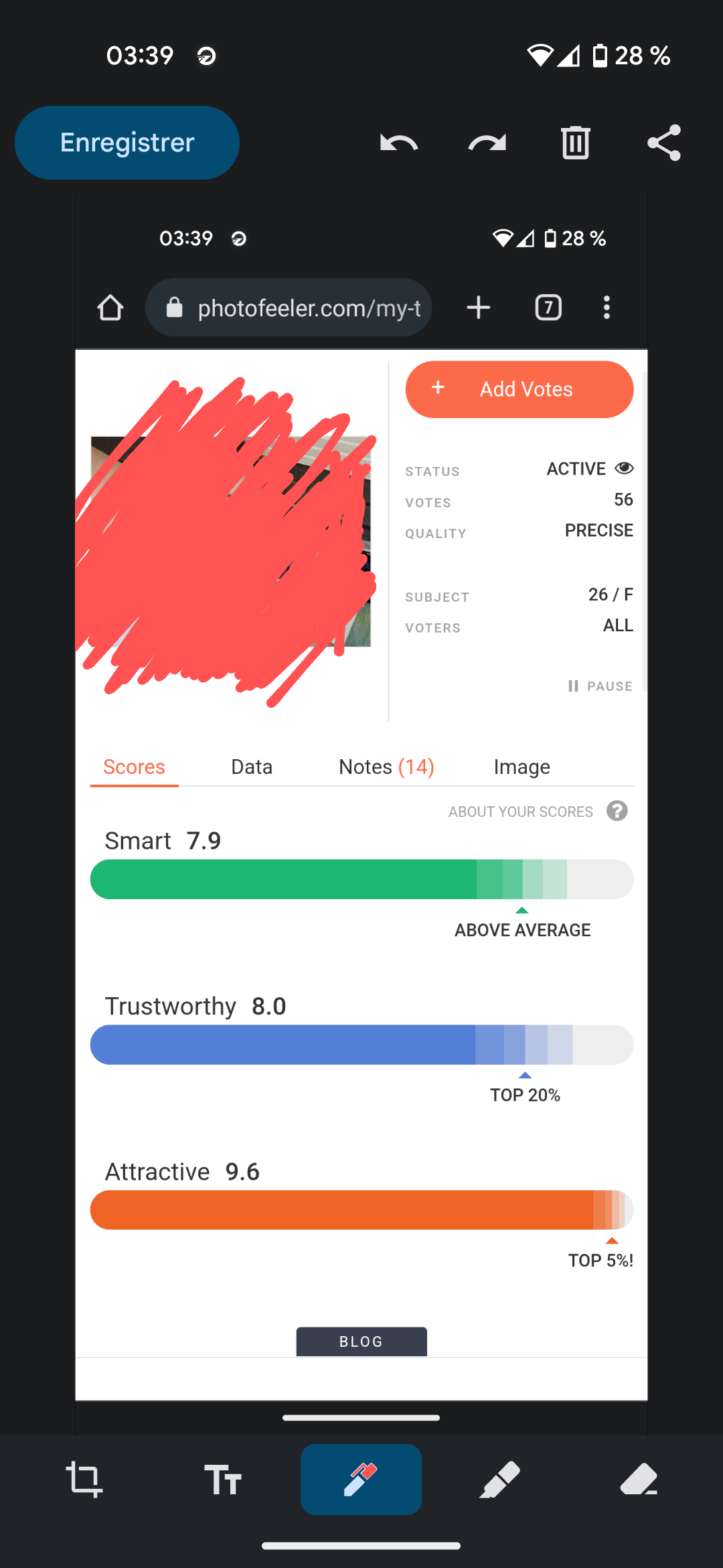 Photofeeler ne vaut rien en d茅pit du fake, j'ai eu 9.6 sur une photo alors que sur les autres je tourne 脿 8![]()