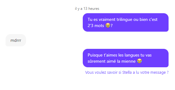 Le 22 août 2023 à 14:02:10 :Réponds lui :« Mdrrr chakal 👌 🤣 »