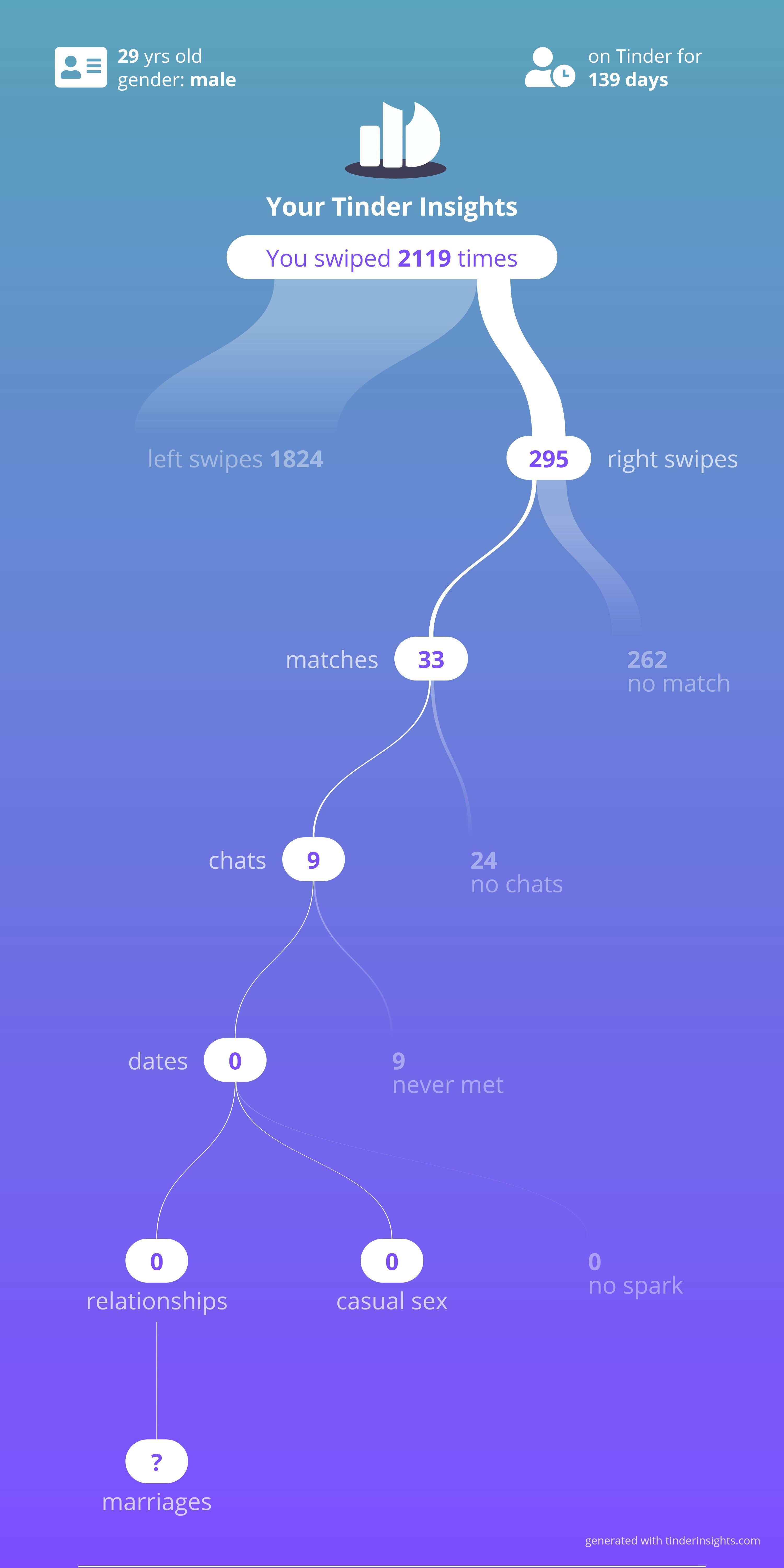 Mais je ne rencontre personne pour autant et les femmes ont un taux de matchs trois fois supérieur alors qu'elles doivent être bien plus sélectives sur leurs swipes donc ça sous estime le taux de likes reçus par elles vu qu'elles dislikent la quasi totalité des mecs qui les likent.