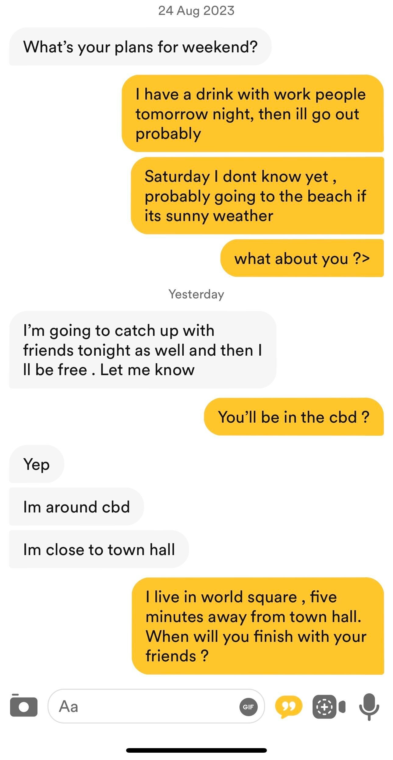 Et puis, je reçois ces message sur bumble, de la latina, sachant, comme je lai dit, nous n'avons jamais échangé nos numéros , et on s'est jamais vu en IRL, elle sait pas ou je suis ce soir, ni comment je suis habillé: RIEN.