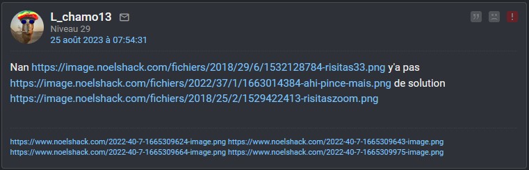 . Le seul truc qui me dérange, c'est que les liens noelshack ne marchent pas, du coup impossible de voir les stickers, ce qui rend la lisibilité de certains topics assez limitée.