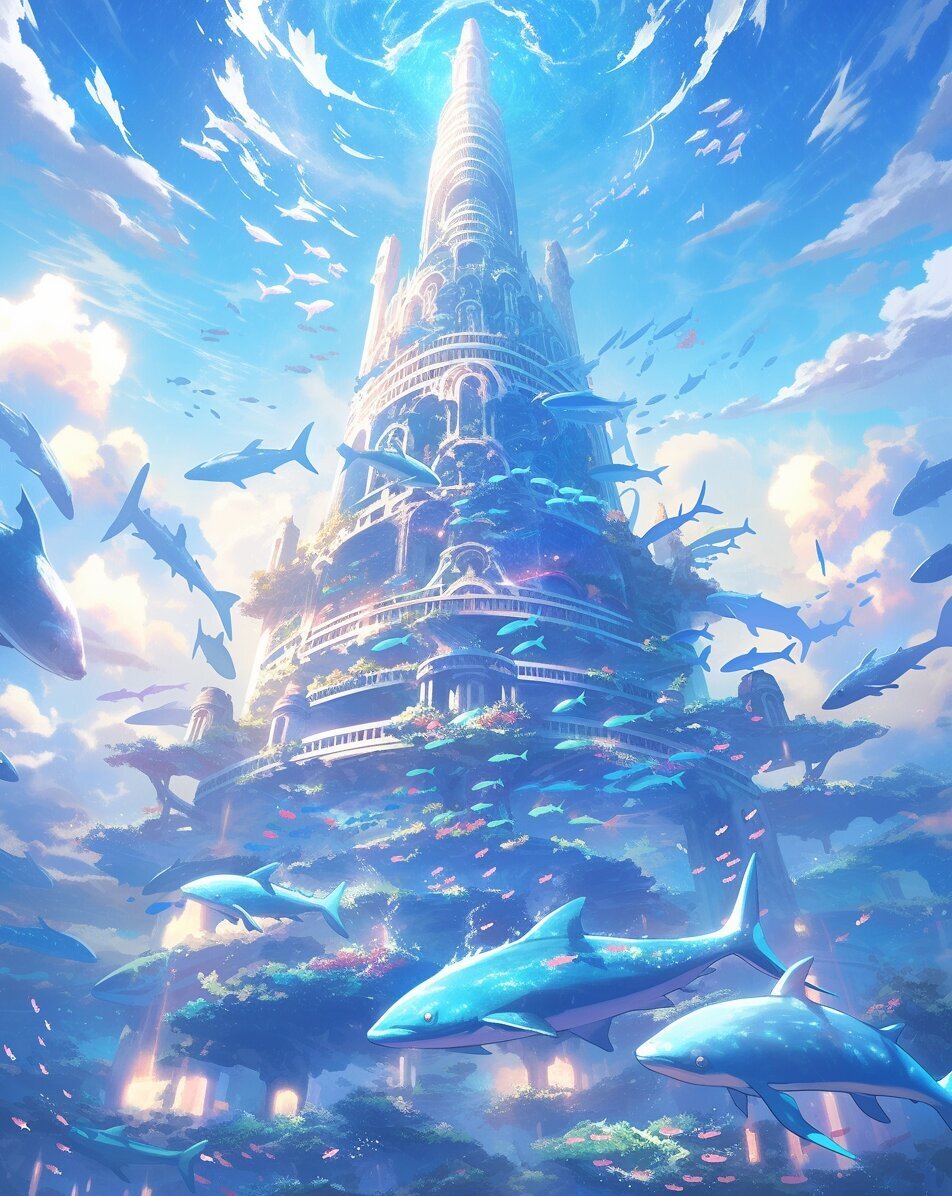 Vous sautez avec légèreté, de dauphins en dauphins, pour atterrir sur un des rebords de la tour marine.