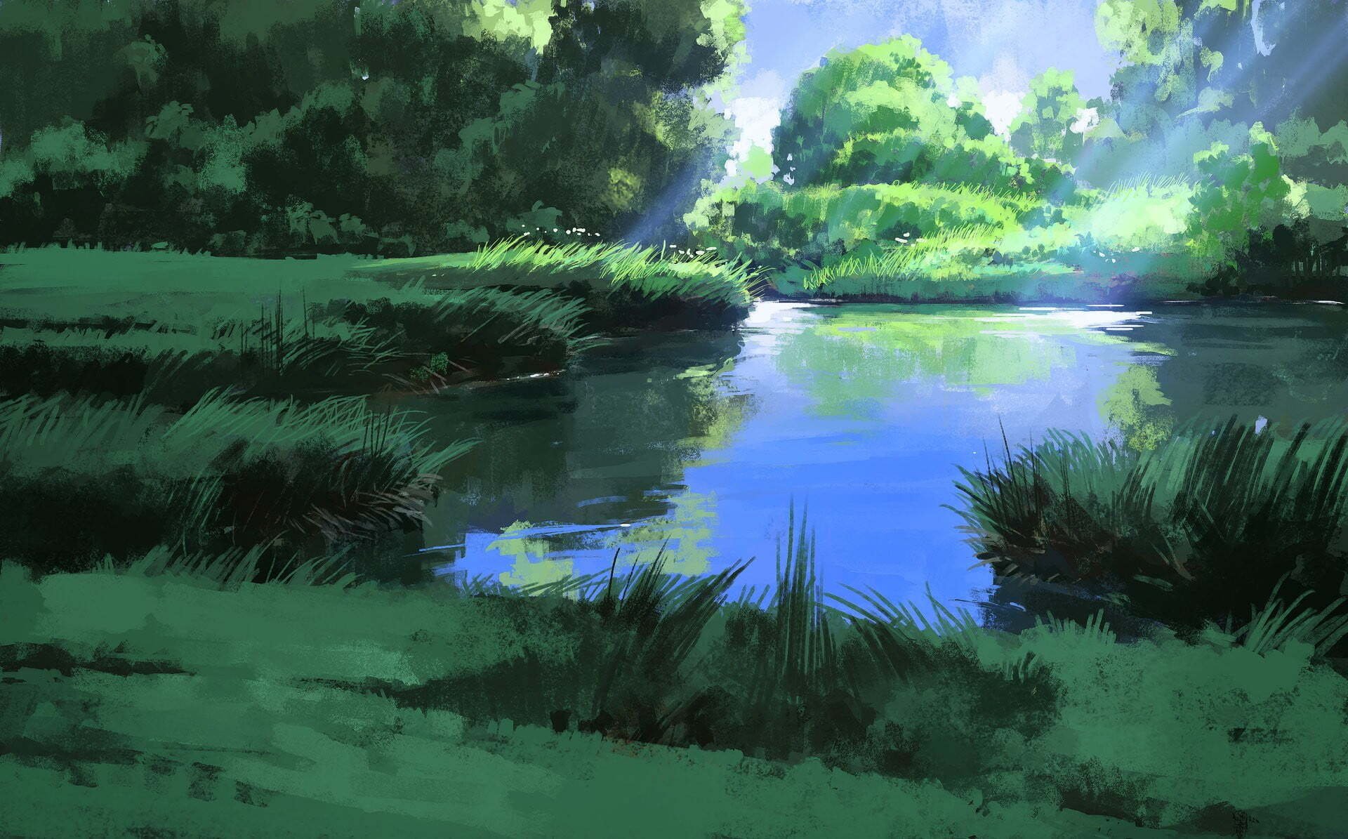En se redressant, Célestin s'aperçoit qu'il est au bord d'une rivière, dans un paysage verdoyant.