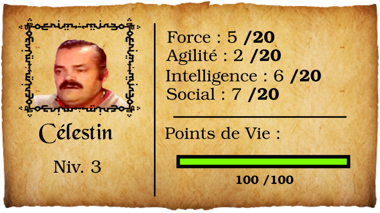 Les personnages ne peuvent pas voir la fiche de quête de Célestin. (C'est-à-dire qu'ils n'ont pas accès à ses skills en Force, Agilité, etc.)