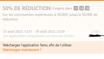 en gros ils ont un code de pré-rentrée comme Aliexpress, mais elle donne -50% sur TOUTE LA PLATEFORME ainsi que le panier dès 50€, donc ça se transforme en 25€