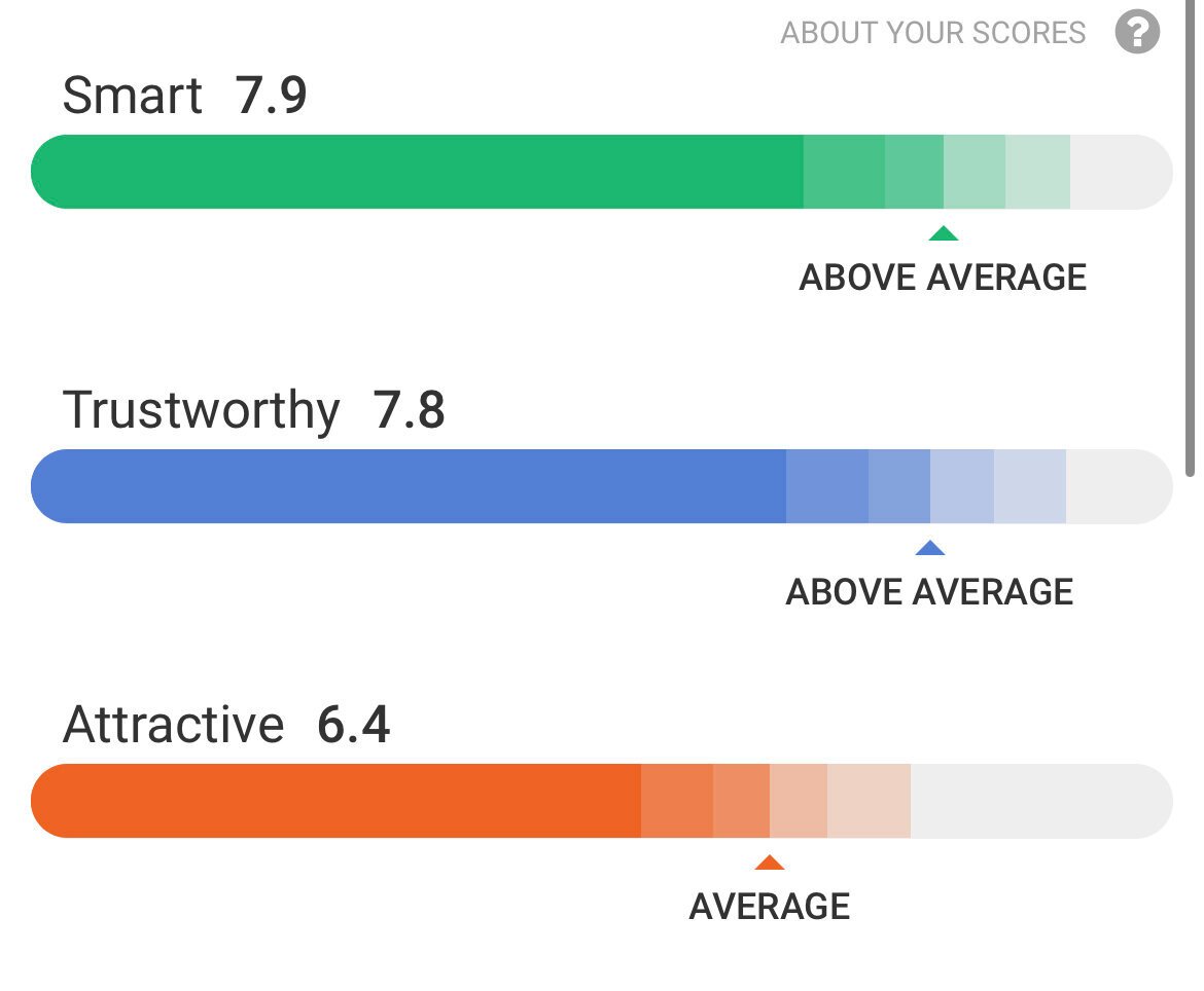 T’es sûr que c’est fiable photofeeler ? Elles notent pas au hasard ?Surtout que ces tchoins si t’es bg elles mettent que t’as l’air d’être quelqu’un de confiance par contre si t’es moche elles mettent que non