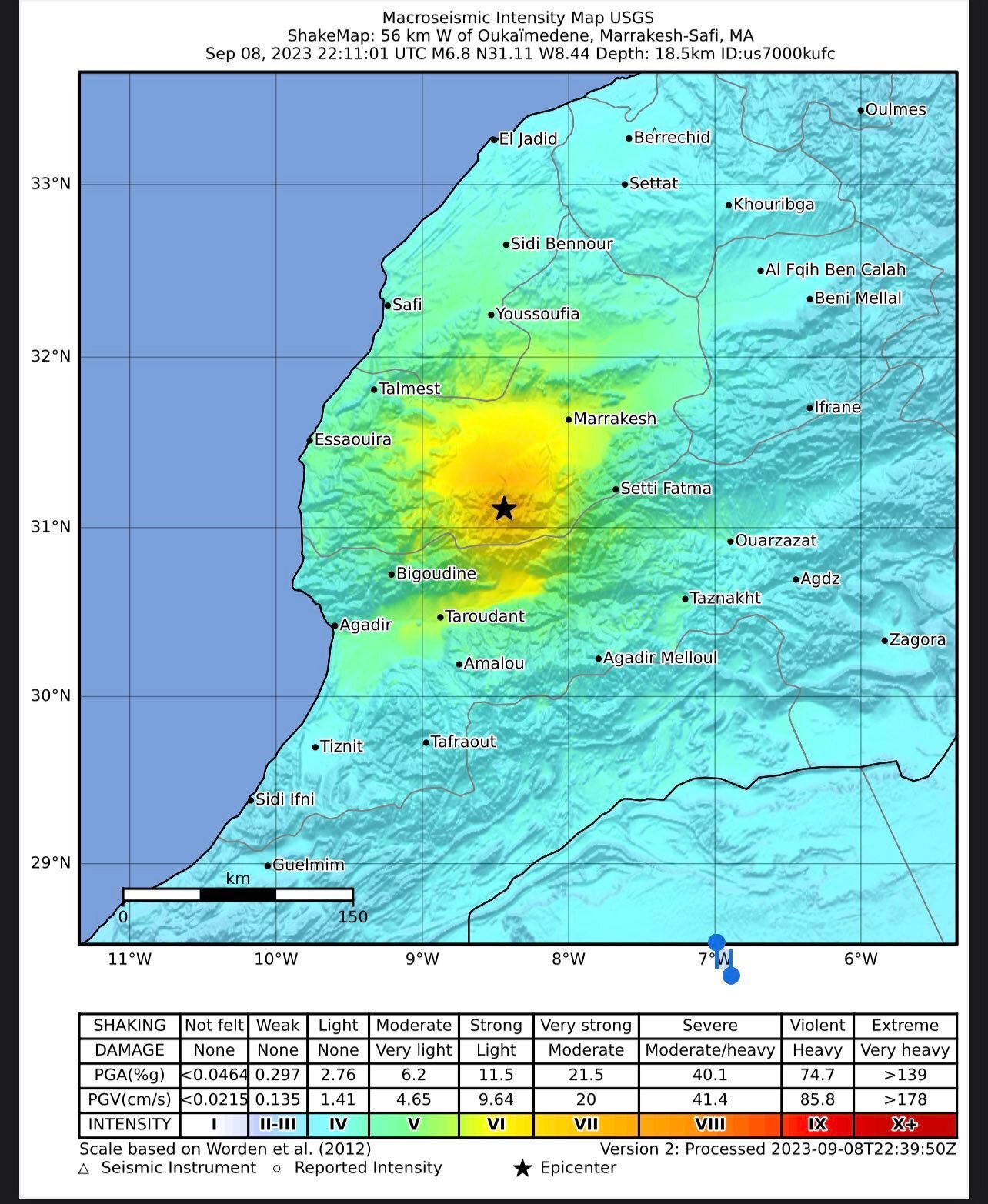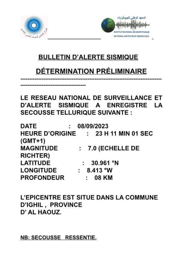 🔸 L'Institut National de Géophysique réévalue la magnitude du séisme à 7 sur l'échelle de Richter et indique que l'épicentre du séisme était situé dans la province d'Al Haouz, au sud-ouest de Marrakech.