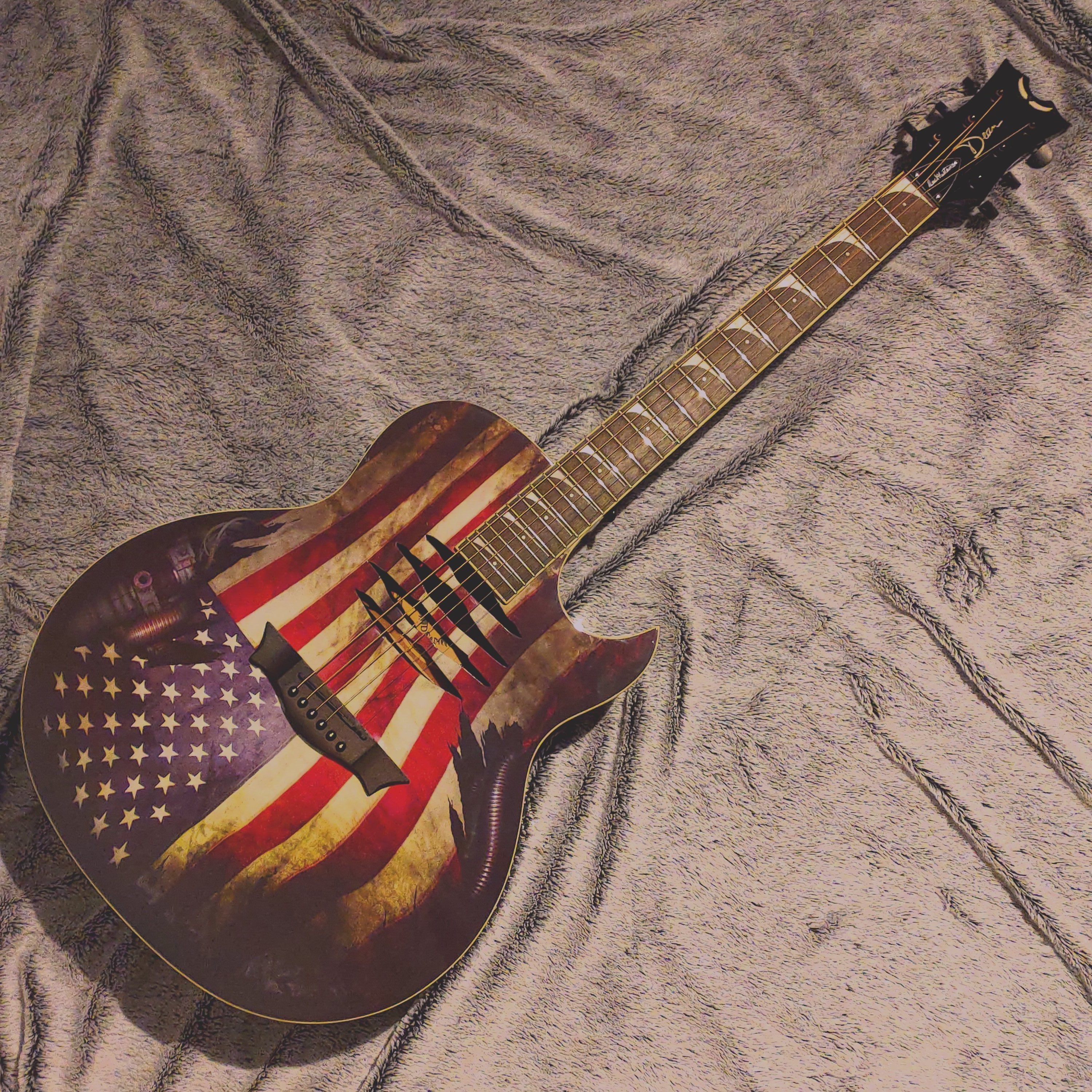 > Heureusement il me reste une strat squier que je peux pas brancher, et une Flame pas trop dégueu (à la base je crois qu'ils font que des acoustiques, je sais pas d'où sort celle-là mais c'est une électrique style ibanez)
