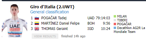 - Plus gros écart jamais enregistré sur le GIRO sur un dauphin depuis BASSO sur le GIRO 2006- Plus grand nombre d'étape remporté par le vainqueur d'un GC d'un GT avec 6 étapes depuis ARMSTRONG et ses 5 étapes sur le TDF 2004