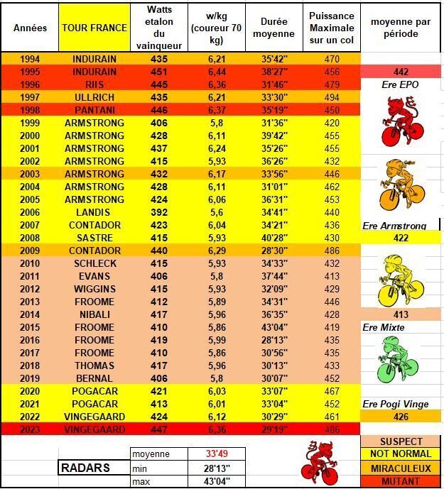Persoent je suis pas naïf, je m'intéresse plus tant que ça aux performances pures, ce qui me fascine c'est les tactiques de course, le reste OSEFent (oui mais si t'es dopé t'attaques de loin et c'est fini, calmez-vous les mecs sont des physiologies hors du commun déjà sans dopage, en supposant qu'ils soient chargés vous pensez vraiment que la hiérarchie changerait la team ?