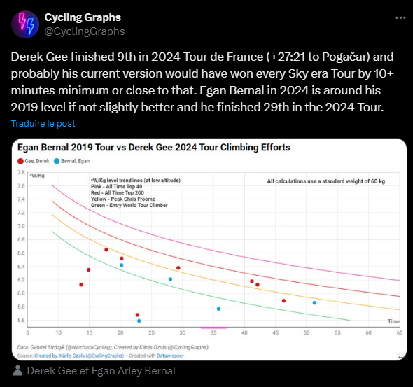 J'avais encore un doute, sur le fait que des mecs comme Pogi et Vingo sont juste des talents générationels.Derek Gee aurait remporté tous les Tour pré Covid avec ses données de puissance du Tour 2024 selon ce post : http s://x.com/CyclingGraphs/status/1815636032164876516