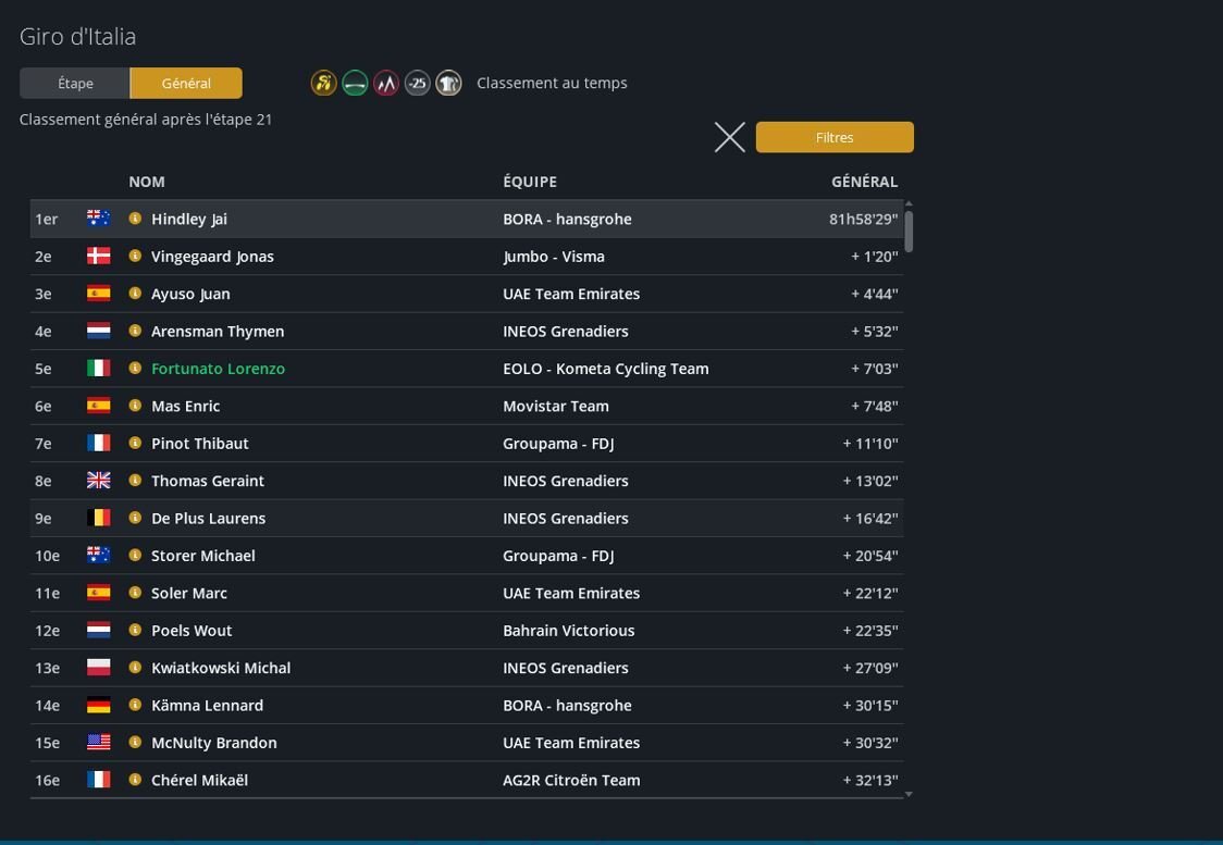 à 45 secondes de Jai au soir de la 18ème étape j'ai prit 3 minutes au Tre Cime de Lavaredo et le lendemain encore 3min sur le chorno de Monte Lussari