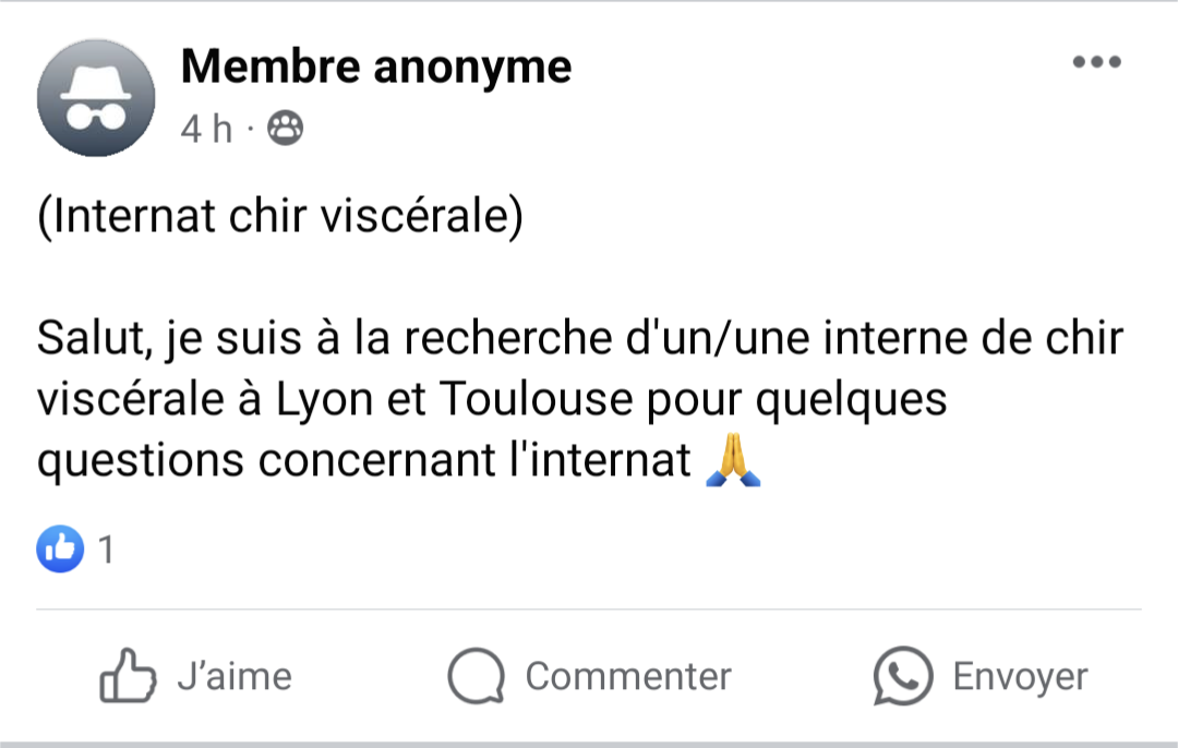 Heureusement il n'a pas compris qu'en postant en anonyme sur Entraide il n'avait aucune chance qu'un interne de chir lui mette dans les commentaires "viens MP"