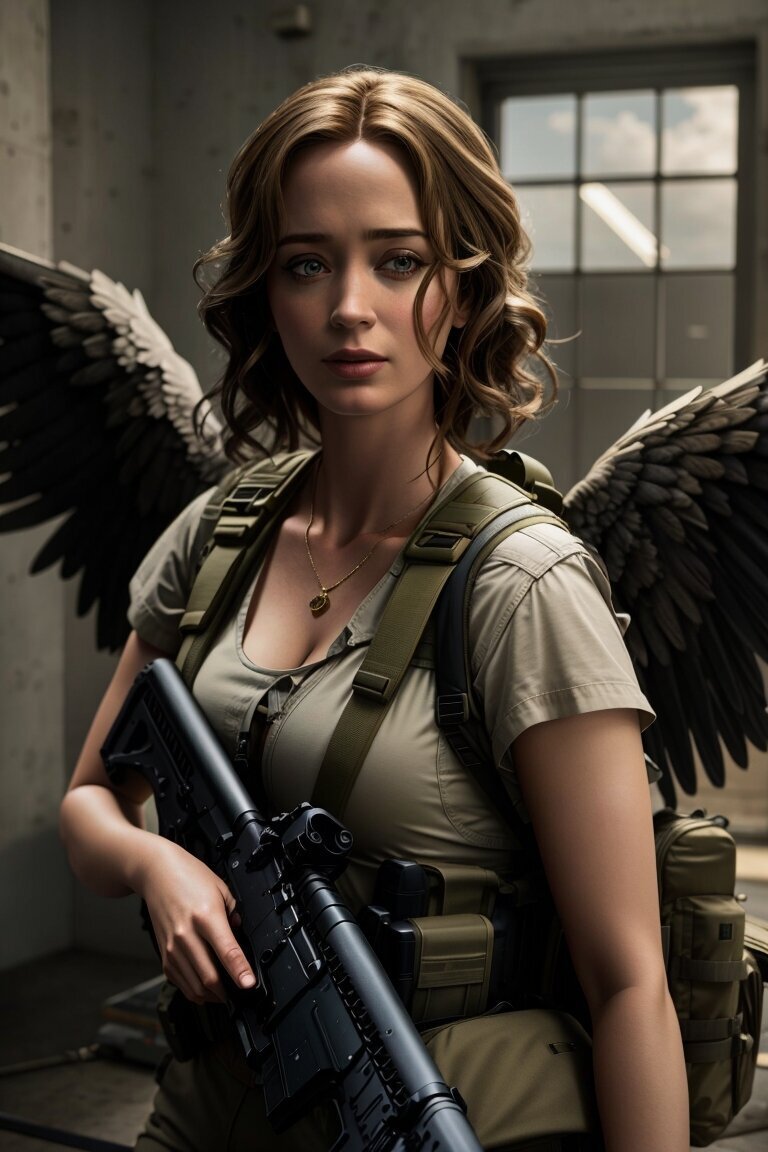 Emily Blunt avec en main un m16 en main et des ailes d'ange dans le dos