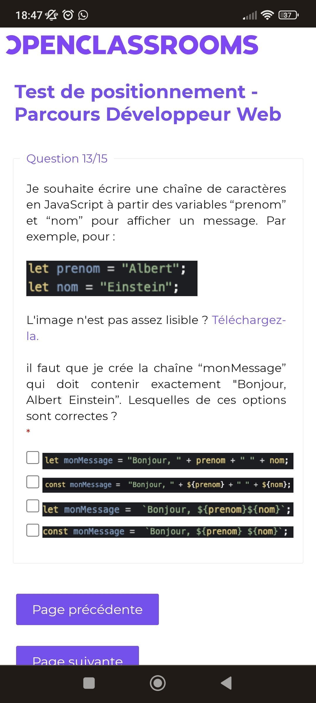 Salut les clés, je me suis inscrit à une formation de développeur web chez OCR, je me suis entrainé sur html et css, sauf que je ne savais pas qu'il fallait s'entrainer aussi sur Java. j'ai déja lancé l'inscription, j'ai les test de positionnements à passer sous 48h mais je n'arrive pas à répondre à certaines questions sur des lignes de code java. Si un dev pouvait me trouver les bonnes réponses, je lui envoie 10eu PayPal il y a 6 questions ou je bloque, venez en mp
