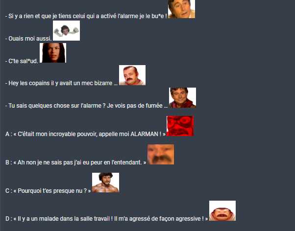Mais qu'est-ce qui se passe avec jvc ? Non seulement ils font sauter la fic et nos posts avec :o Bon, pour en revenir au chapitre, les stickers de Sardoche me tuent, tu peux faire des lignes de dialogues rien qu'avec eux, c'est magique.Sinon pour mon vote, je vais voter pour la B :3