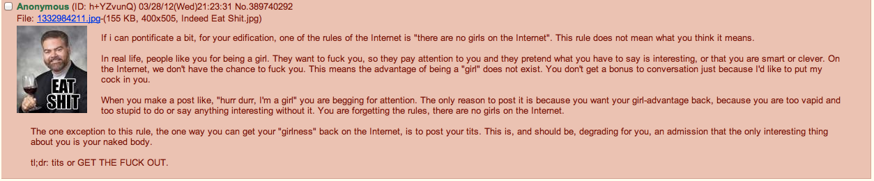 En fait, de base, le principe de dire : "Women don't exist on the internet" c'était pas censé être pris littéralement, c'était une façon de dire aux femmes que leurs avantages sociétaux n'avaient pas lieu d'être sur internet (puisqu'on peut pas baiser une femme sur internet) et que donc chacun était considéré comme une entité plutôt que comme une personne genrée mais ça a été repris sans être compris.