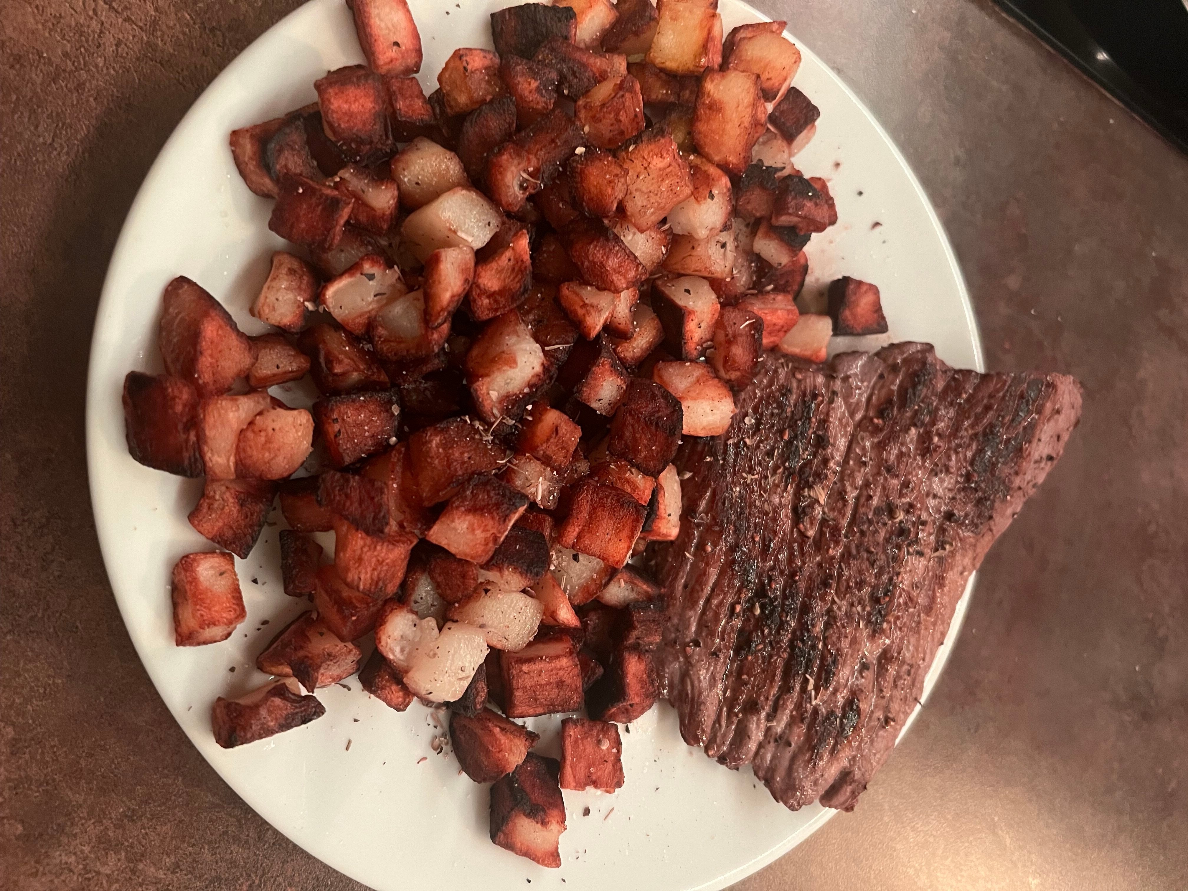 C EST PAS COMME CELA QUAND FAIT D AILLEURS FALLAIT COUPER TES POMME DE TERRE EN FRITE EST SURTOUT LE STEAK TROP CUIT . IL ME SEMBLE VUE LA COULEUR DE TON STEAK .