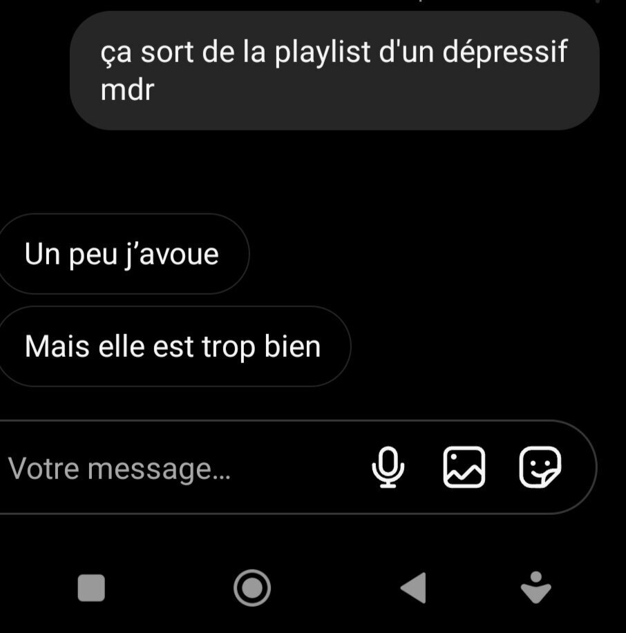 Le 23 octobre 2023 à 13:21:05 :tu commences malmais tu lui dis que t’adores aussi et tu lui proposes une musique de la même vibe