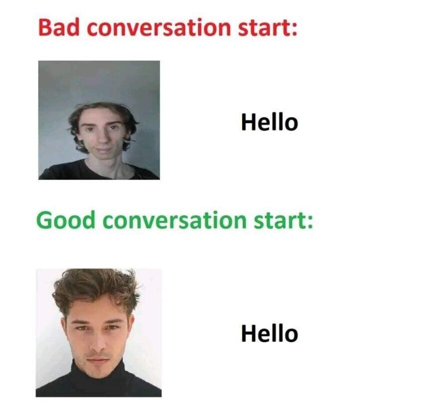 Le mec du dessus se confie correctement, cache son menton fuyant avec une barbe et se cultive un corps correct et il pourra dire "hello"