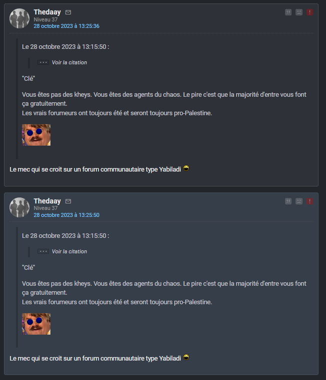 Les vrais forumeurs ont toujours été et seront toujours pro-Palestine.Le mec qui se croit sur un forum communautaire type Yabiladi
