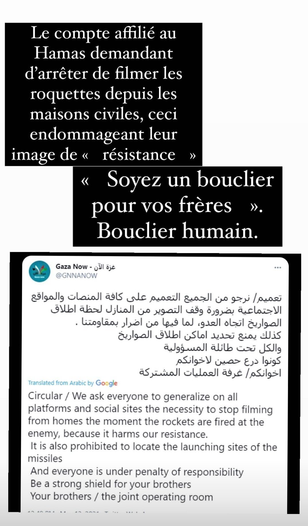 Depuis le début de ce conflit j'ai vu de nombreuses vidéos ou les dirigeants Palestiniens, mais aussi des gens de la société civile Palestinienne, appellent très ouvertement les civils de Gaza à je cite : "mourir en martyr", à ne pas quitter les zones de guerres, voir même explicitement à servir de boucliers humains :