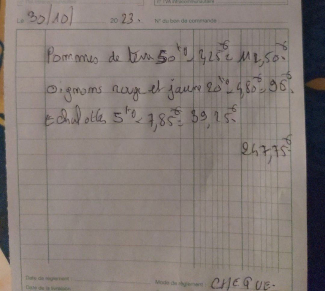J'ai un maraîcher qui est venu frapper à ma porte. Apparemment le gars fait le tour des villages deux fois par an et il vendait des légumes, des patates etc
