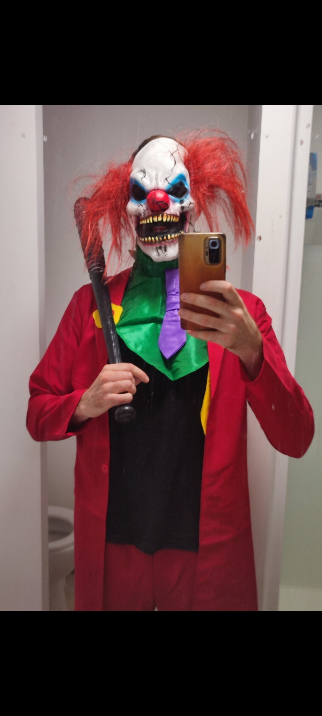 J'était dans la voiture en ville à traîner les rues avec ma tenue et le masque je m'arrêtais à hauteur des gens sans parler je les regardais et je tapais ma batte sur ma porte ,une femme à crier j'ai fais peur à pas mal d'enfants plusieurs personnes m'ont dit que ça faisais peur.