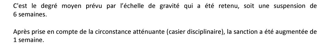 Ça n'a aucun sens ayoooooÀ noter que la circonstance atténuante du casier judiciaire vierge rajoute une semaine de suspension. C'est d'ailleurs de là que vient l'écart d'une semaine avec le déblayage de Vergnes ou du plaquage de Moefana