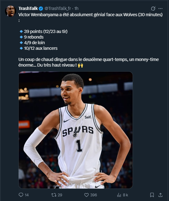 Les Spurs sont vraiment une équipe étrange. Ils perdent contre des équipes mal classées mais il ont battu toutes les grosses équipes cette saison tout en étant catastrophique à 3 pts. Évidement l'impact de Wemby est monstrueux.
