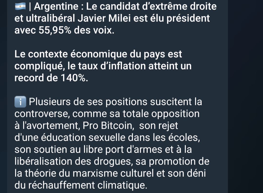 Le 20 novembre 2023 à 04:55:37 :Ahi ce tarax, paix sur l'Argentine