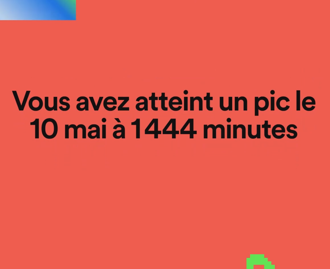 Par contre j'ai quand même cassé la matrice avec Crystal Edge car dans une journée il y a 24h de 60 minutes donc 1.440 minutes, right ? Et bien Spotify me dit que j'ai atteint mon pic le 10 mai à 1.444 minutes