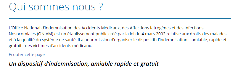 J'ai regardé, j'ai bien vu ce que c'était et je vais pas brader ma chance de me dédommager correctement pour une association comme ça. J'ai bien compris, c'est une association pour les gens qui n'ont pas d'argent pour faire un arrangement à l'amiable. Est-ce que Johnny Hallyday a saisi L'ONIAM ? Evidemment que non, parce qu'il avait les moyens et que c'était beaucoup plus avantageux de passer par la voie du contentieux.