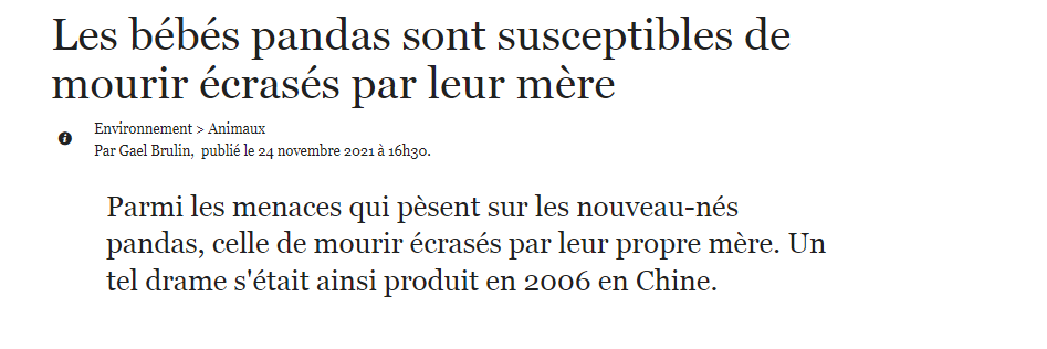 -Les femelles avortent souvent de leurs bébés après leur naissance. Quand un panda a des jumeaux, il est presque garantie que l'un d'entre eux va finir abandonné. En plus, la mère est immense comparé au bébé et ça fini souvent par un accident. C'est pour ça que les gardiens de zoo leur confisquent leurs bébés à la naissance.