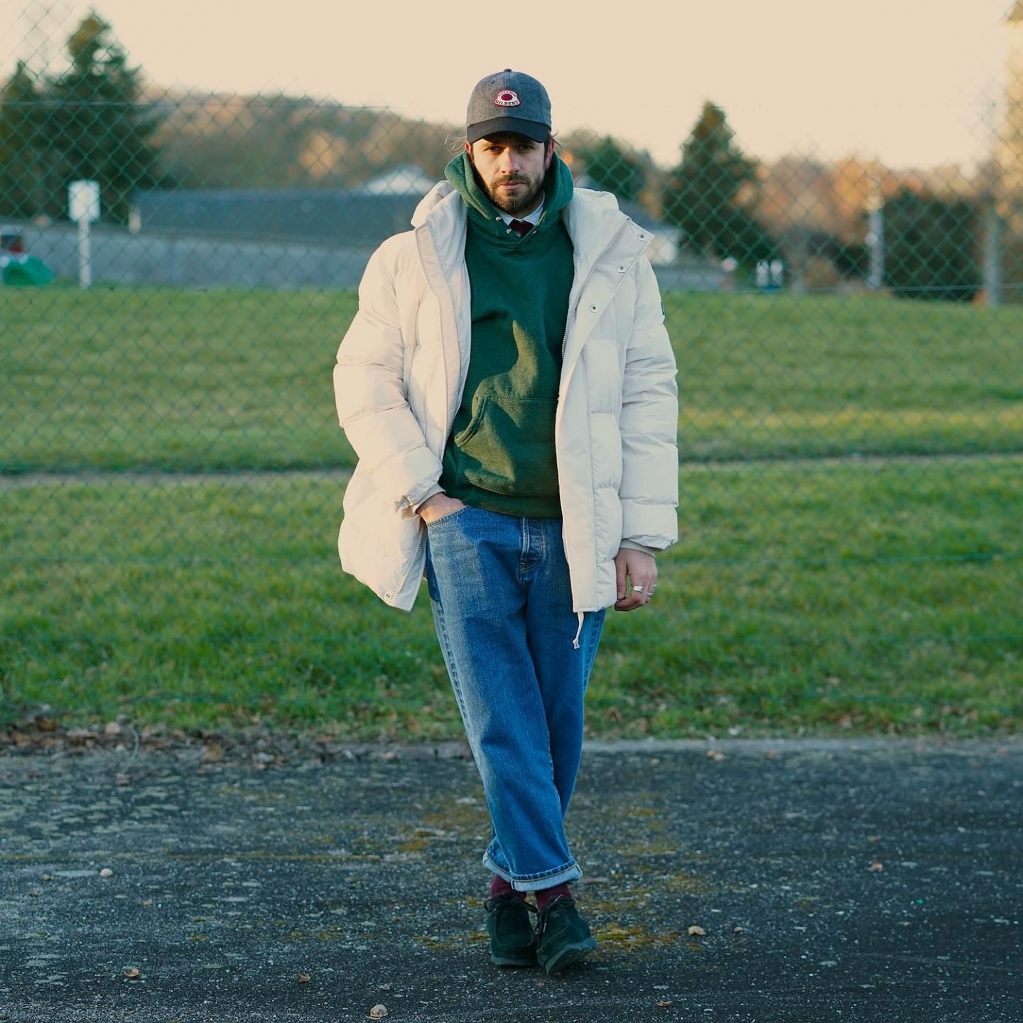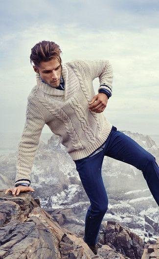 Froid léger : Gros pull camioneur blanc stylé + jeans ou chino + sneakers![]()