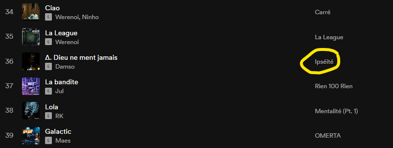 D'ailleurs la boucle bordel, on voit qu'on sort du bon son ces dernières années quand Damso fait toujours partie du top 50 40 avec un son sorti il y a 6 piges