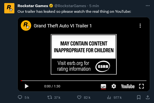 ALERTE ROCKSTAR A REAGI A PROPOS DU LEAK : https://twitter.com/RockstarGames/status/1731813331244085531Je trouve ça une bonne réaction de leur part