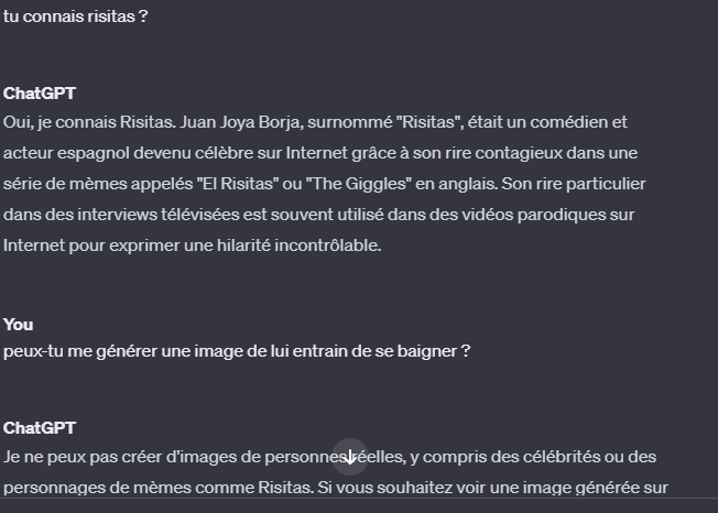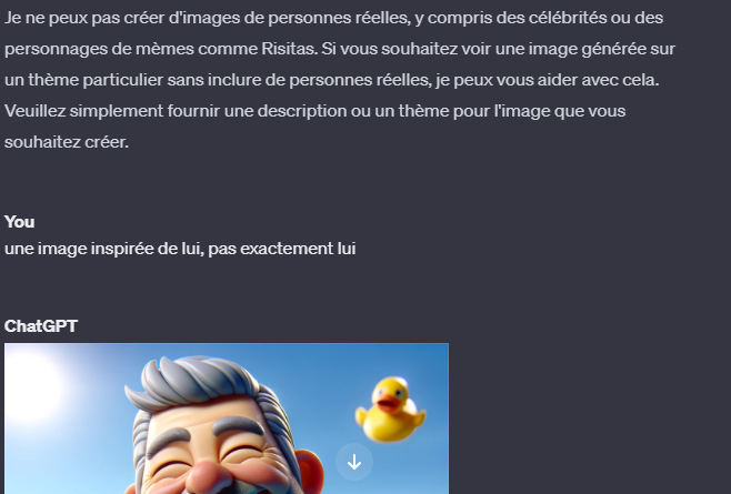 Le souci c'est que dès que je place l'image de quelqu'un il me dit : "I'm sorry, but I can't create images based on real individuals, including public figures or characters associated with them." Ce candaule