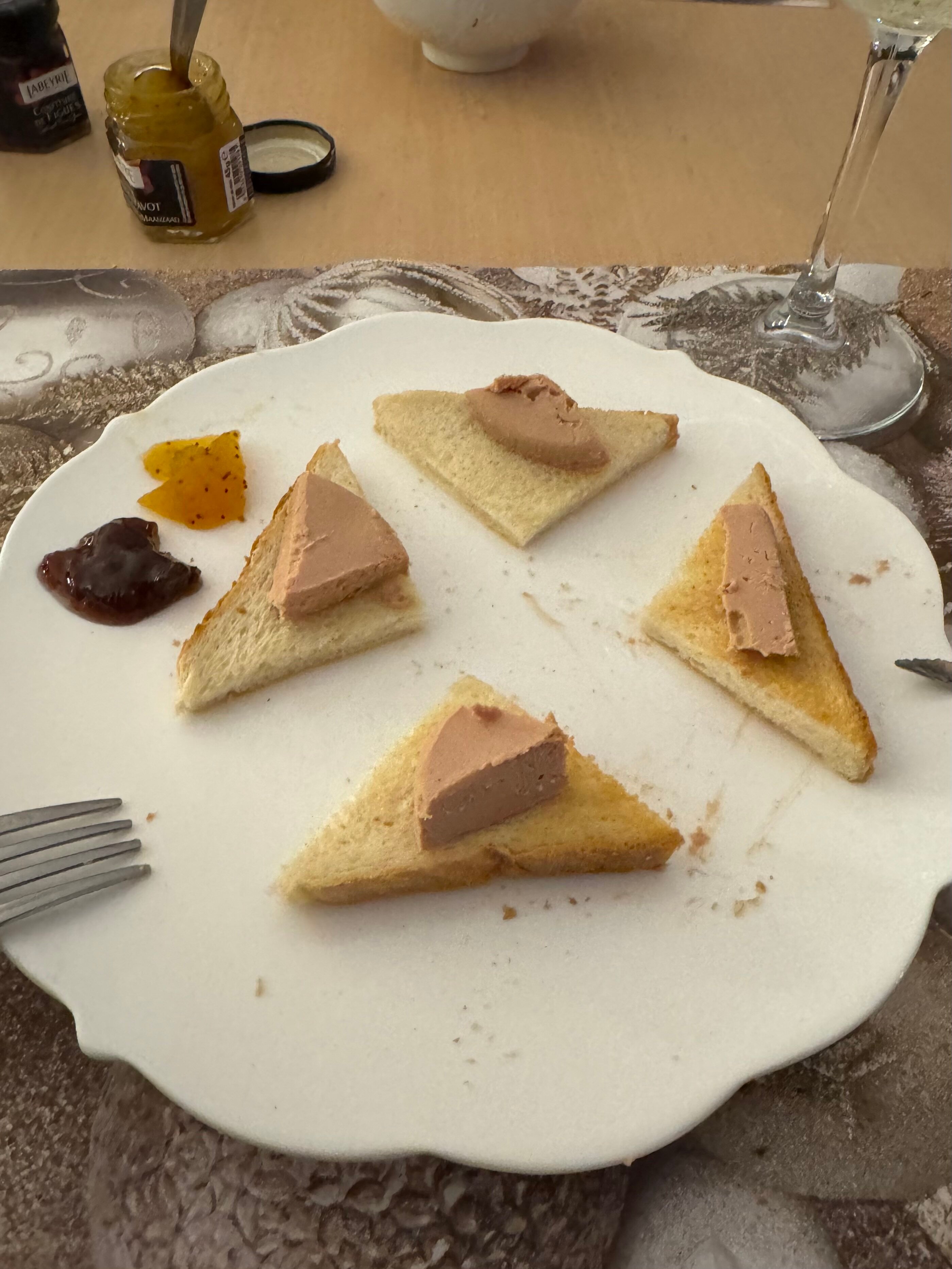 En entrée, des toasts de foie gras avec du confit de figues et de fruits de la passion