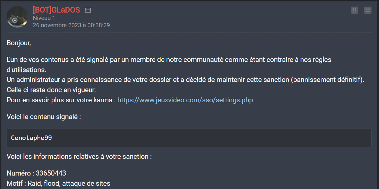 "Un administrateur a pris connaissance de votre dossier et a décidé de maintenir cette sanction (suppression). Celle-ci reste donc en vigueur.