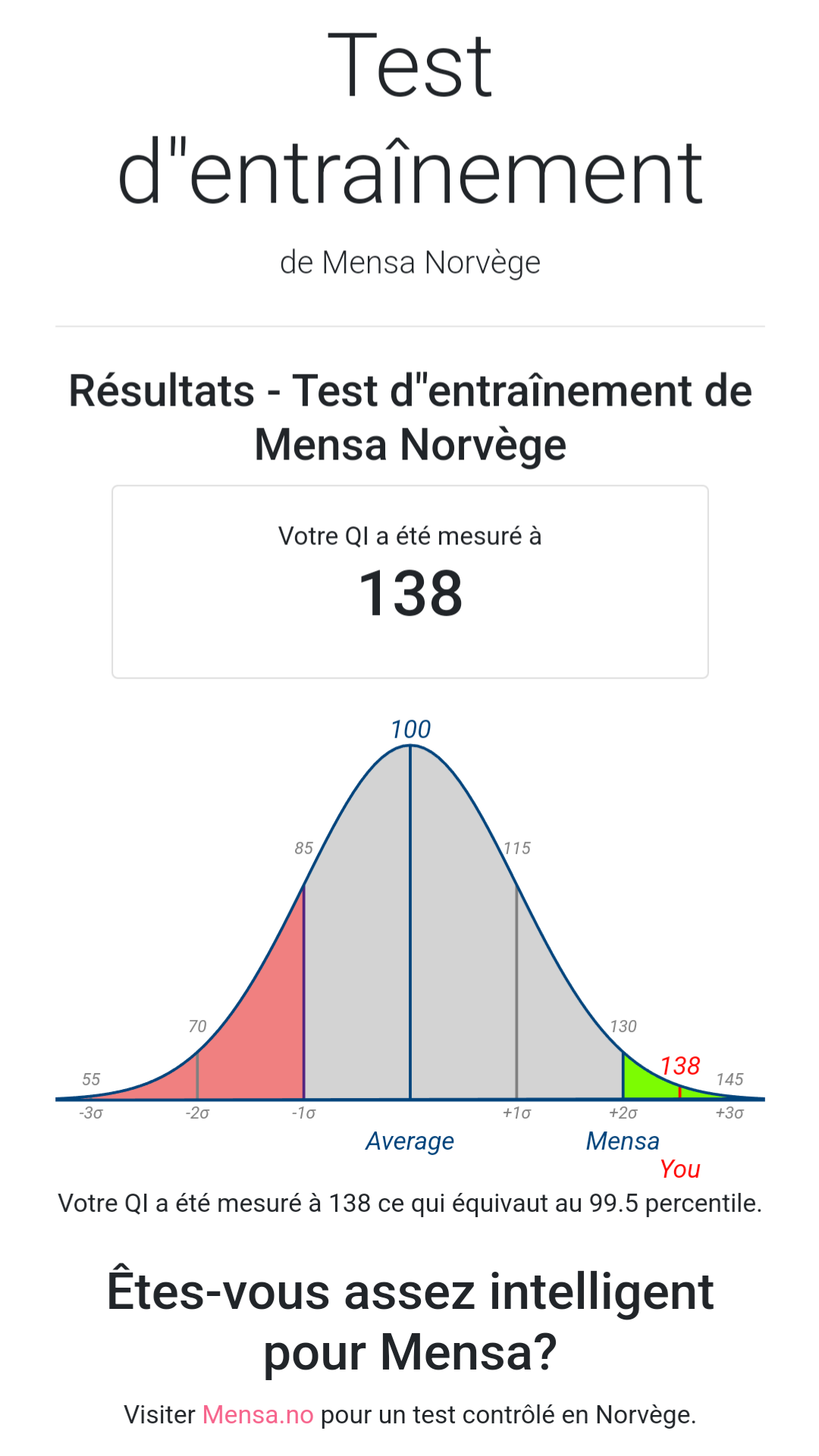 En dépit de mon 147 testé irl.Tu dois avoir des capacités excellentes en mémoire ou en associations d’idées, ce que ne teste pas Mensa ici.