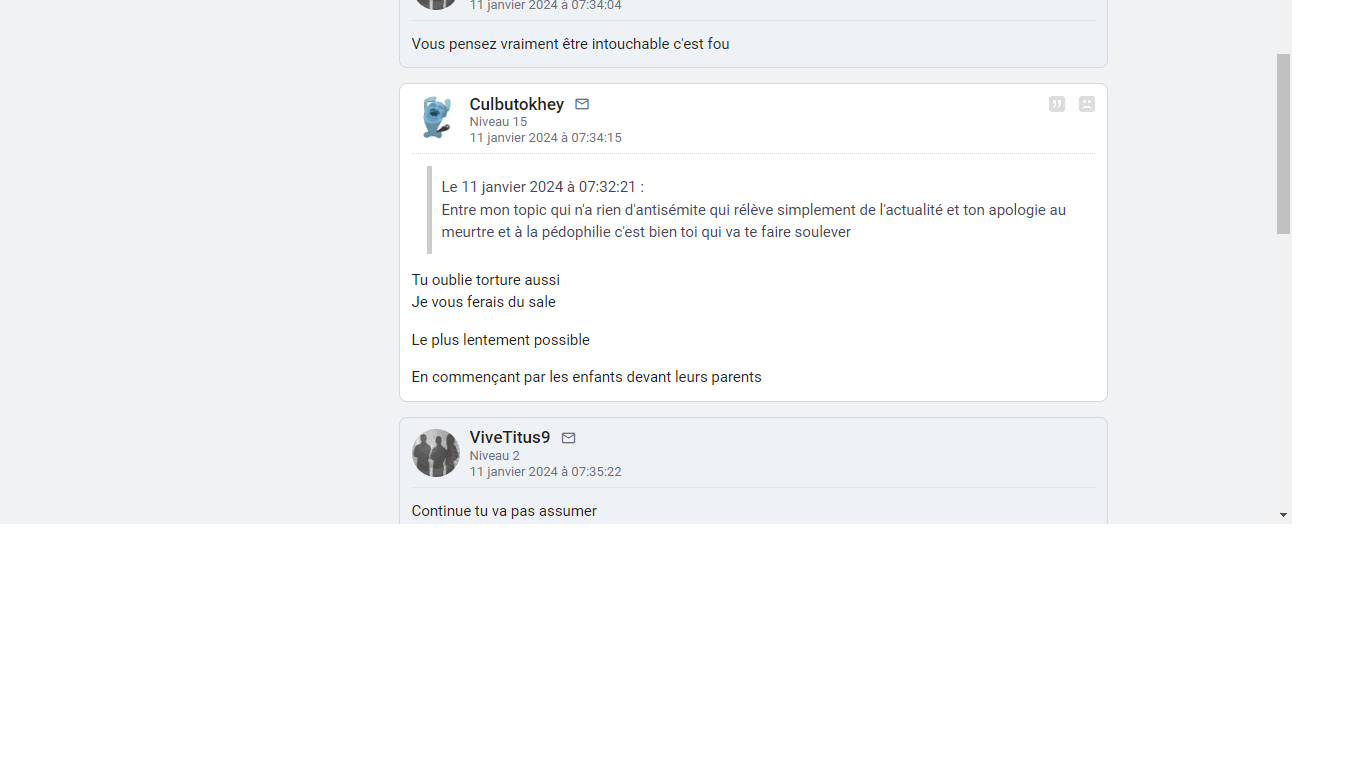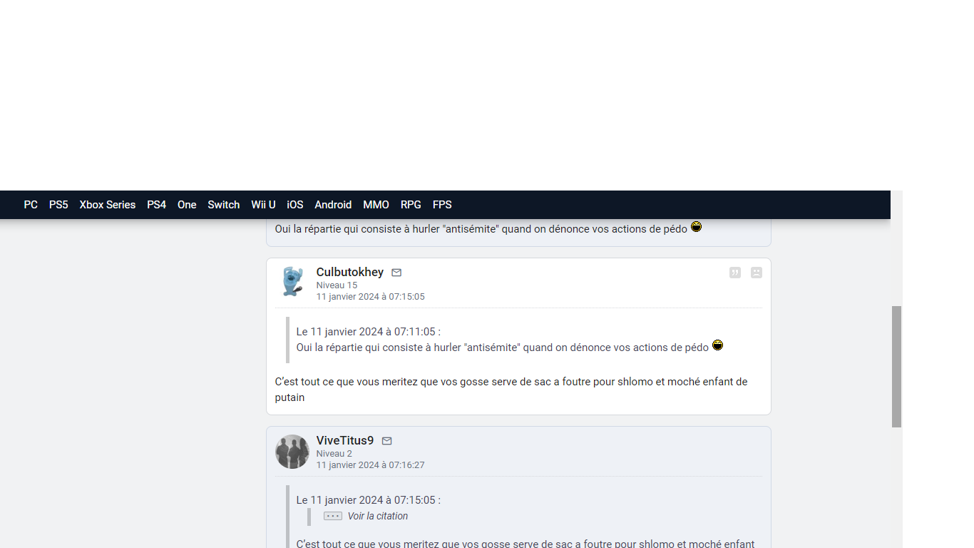 Sur le premier topic,il a accusé l'auteur du topic d'être antisémite et je lui confronte en Mp et me montre son vrai visage https://jv archive.com/forums/message/1245259825
