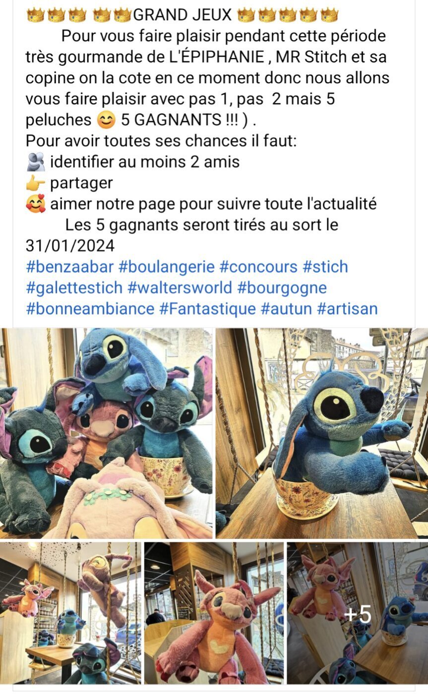 Je partage cette publication publique d'une boulangerie qui aime Stitch car je sais que Stitch est un bon délire du forum https://www.facebook.com/share/SpegnJx1KmVVYyok/