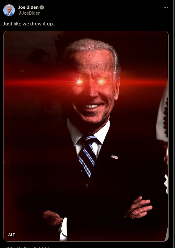 https://twitter.com/JoeBiden/status/1756888470599967000 Bon c'est sans doute pas lui qui a posté ça, mais wtf