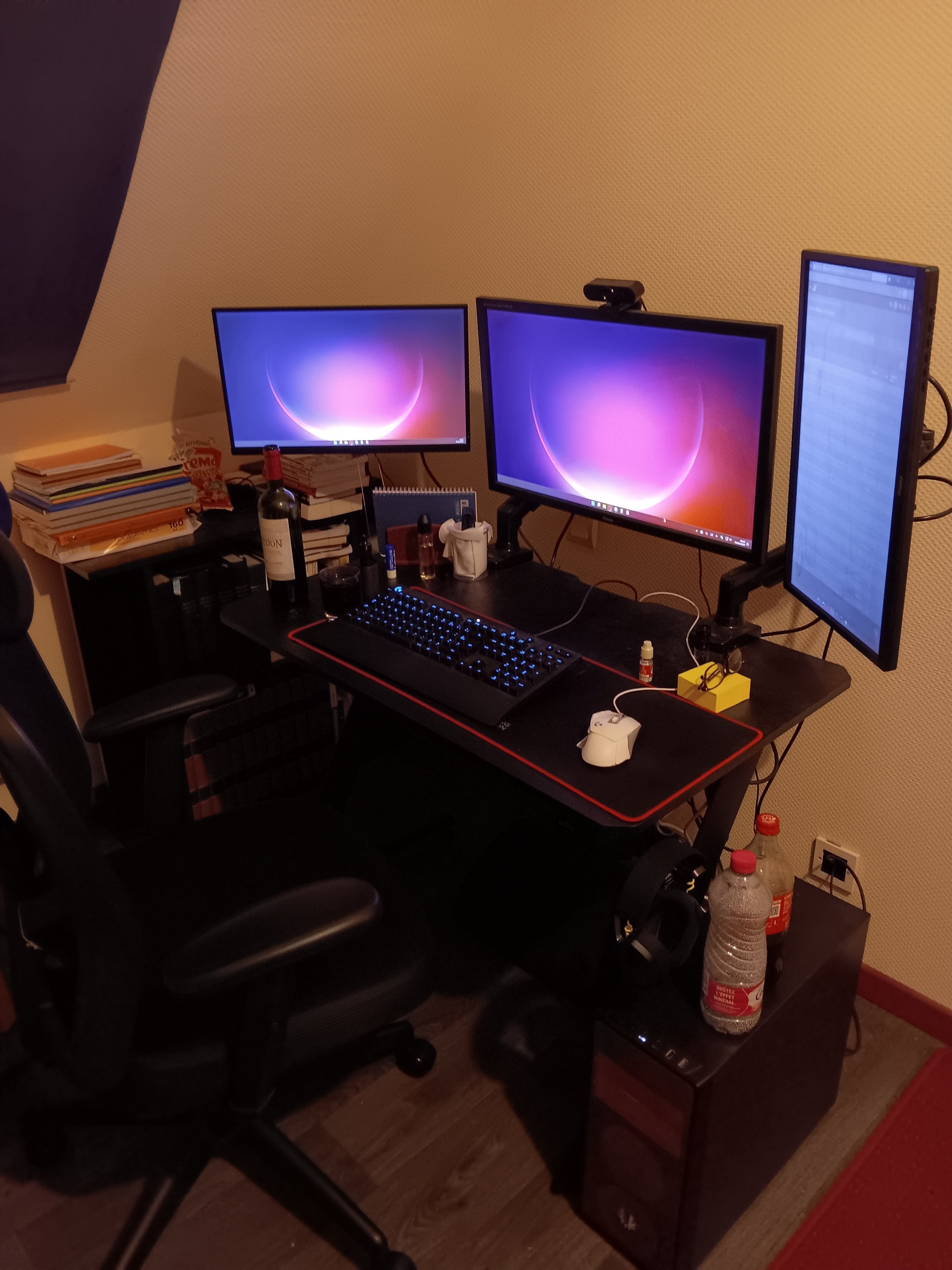Non, j'ai une photo avec mon vieux PC bi GPU, mais maintenant c'est un Meshify 2 XL R9 7900X3D DDR5 96Go MSI X670 ACE et deux RTX 4060ti 16Go + GTX 1070, les écrans sont tous 1080p mais de l'autre côté du mur y'a une TV 4K et un canapé.