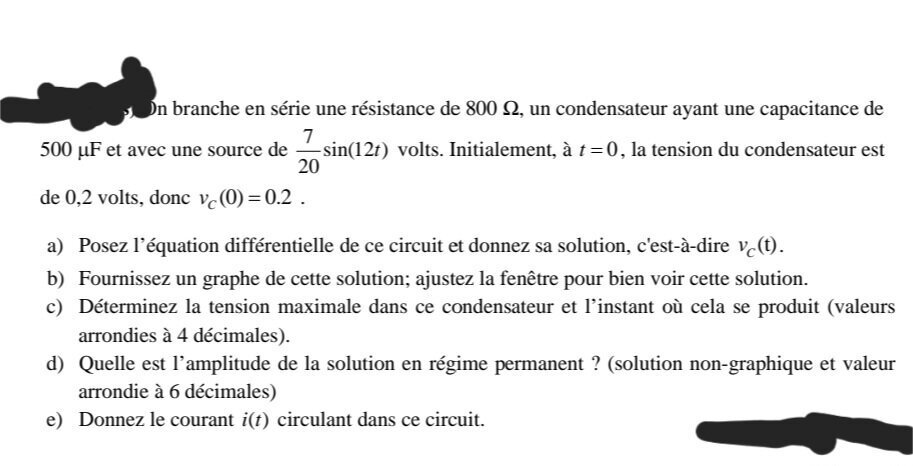 Le 13 février 2024 à 06:05:47 :Tu as juste à appliquer des formules, khey. C dv/dt = i et u = R i avec u+v = source. C'est évident