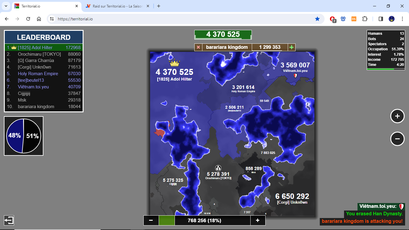 À chaque tick ton nombre de troupes augmente en fonction de tes intérêts indiqués en haut à droite, plus ton territoire sera grand, et + tu auras des intérêts élevés et un plafond de troupes élevés