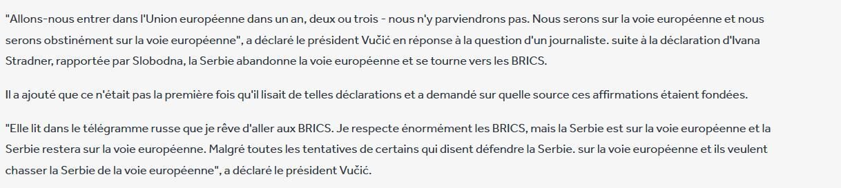Surtout que "la situation des finances publiques en Serbie est exceptionnelle" selon Vucic. Il a bien senti l'arnaque des BRICS et le potentiel de l'UE quand il voit la croissance de ses voisins