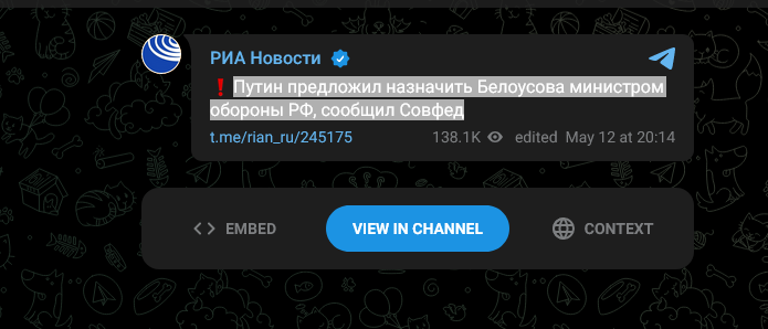 Poutine a proposé de nommer Belousov au poste de ministre de la Défense de la Fédération de Russie, a rapporté le Conseil de la Fédération.